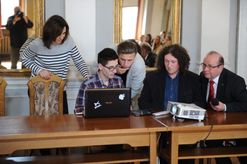 Wizytę rozpoczęło spotkanie w Sali Lustrzanej z przedstawicielami Młodzieżowej Rady Miejskiej, która działa pod opieką Pałacu Młodzieży w Tarnowie. W spotkaniu wziął udział Piotr Augustyński – zastępca prezydenta ds. rozwoju gospodarczego, dyrektor Pałacu Młodzieży, Jerzy Kosiba, przedstawiciele Urzędu Miasta: oraz Joanna Obal z biura promocji gospodarczej i współpracy międzynarodowej i Ewelina Proszowska z Wydziału Edukacji UMT, a także młodzież z klasy dziennikarskiej VII Liceum Ogólnokształcącego. Niełatwej roli tłumacza młodzieżowej wymiany poglądów podjął się Jan Hućko z USC w Tarnowie.