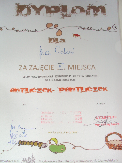 W dniu 17 maja 2018 r. w Młodzieżowym Domu Kultury w Krakowie odbył się XV Wojewódzki Konkurs Recytatorski dla najmłodszych ,,Entliczek- pentliczek”.Maja Cichoń zdobyła II miejsce. Zaprezentowała wiersz D. Gellner pt: ,,Bajeczka”. Uczennica została przygotowana do konkursu pod kierunkiem nauczyciela Izabeli Surdej. Otrzymała dyplom i nagrodę książkową. W konkursie Pałac Młodzieży pięknie reprezentowały także Zuzanna Kandefer i Zuzanna Łakoma. Konkurs adresowany był do dzieci województwa małopolskiego.