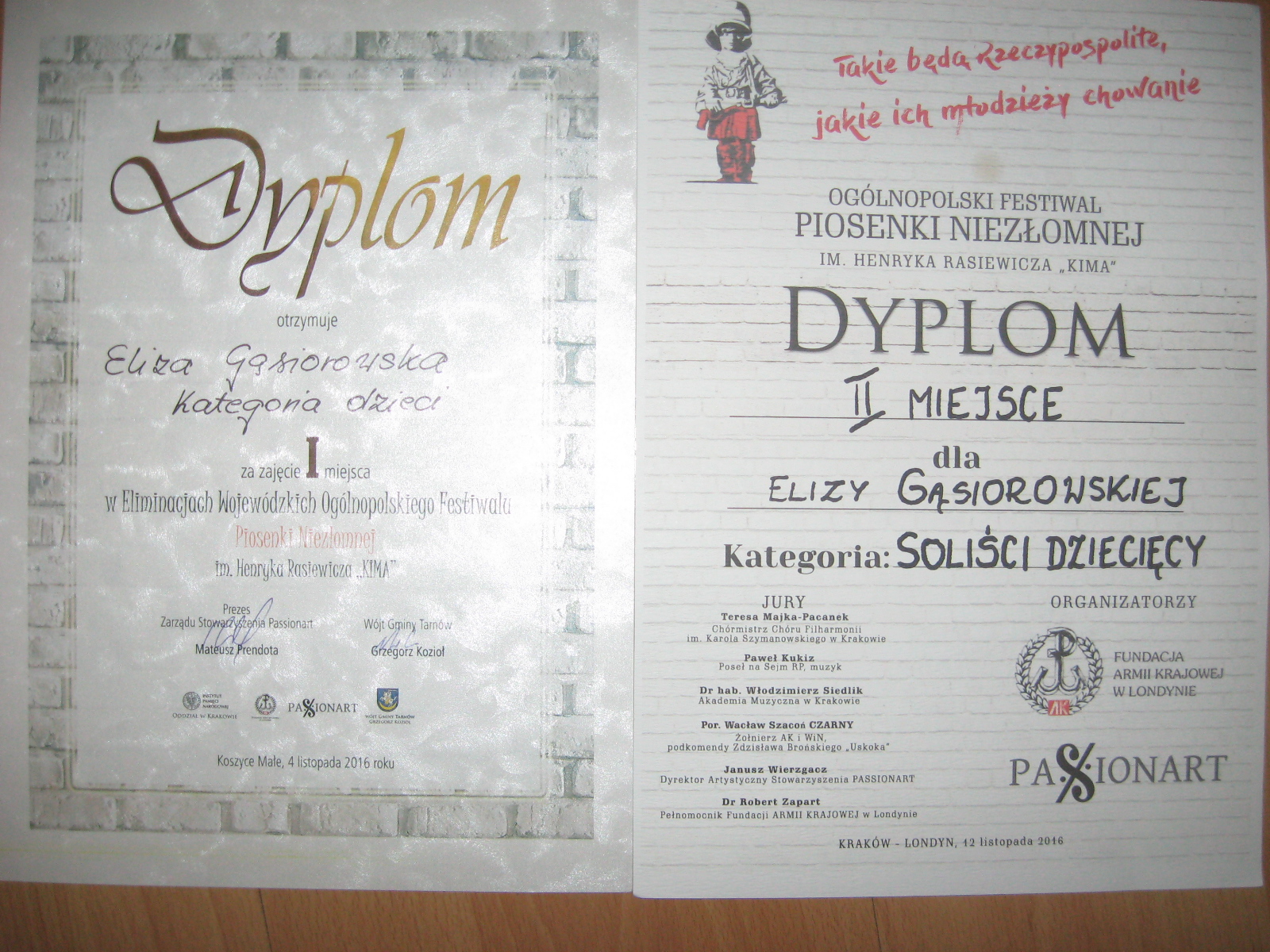 4 listopada w Koszycach Małych odbyły się eliminacje do I Ogólnopolskiego Festiwalu Piosenki Niezłomnej. Eliza Gąsiorowska solistka pracowni wokalnej Małgorzaty Boruch zdobyła I miejsce i otrzymała nominacje do udziału w I ogólnopolskim festiwalu Piosenki Niezłomnej, który odbył się 12 listopada w Krakowie. Eliza zdobyła II miejsce.