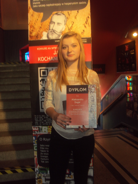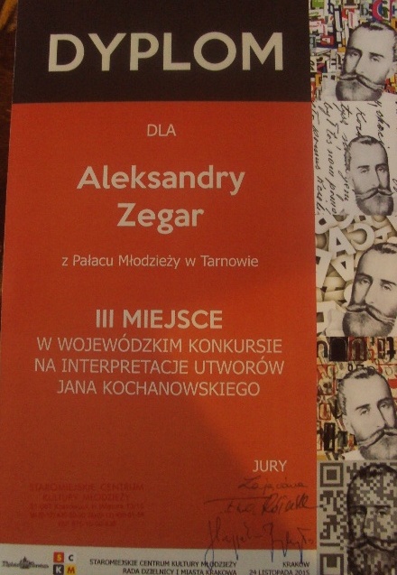 Aleksandra Zegar - wychowanka zajęć teatralnych z grupy starszej Pałacu Młodzieży w Tarnowie zdobyła III miejsce wWojewódzkim Konkursie na interpretację utworów Jana Kochanowskiego, który odbył się w Staromiejskim Centrum Kultury Młodzieży w Krakowie. Finał miał miejsce 24 listopada 2015r. Uczennica do konkursu została przygotowana przez Izabelę Surdej.