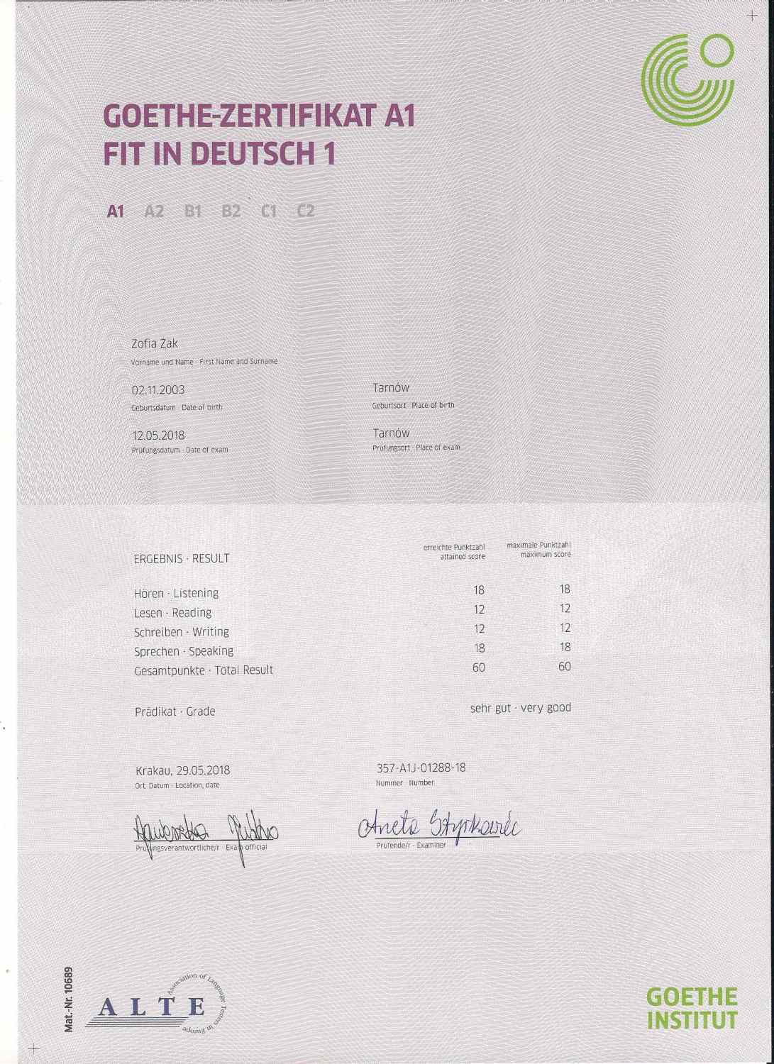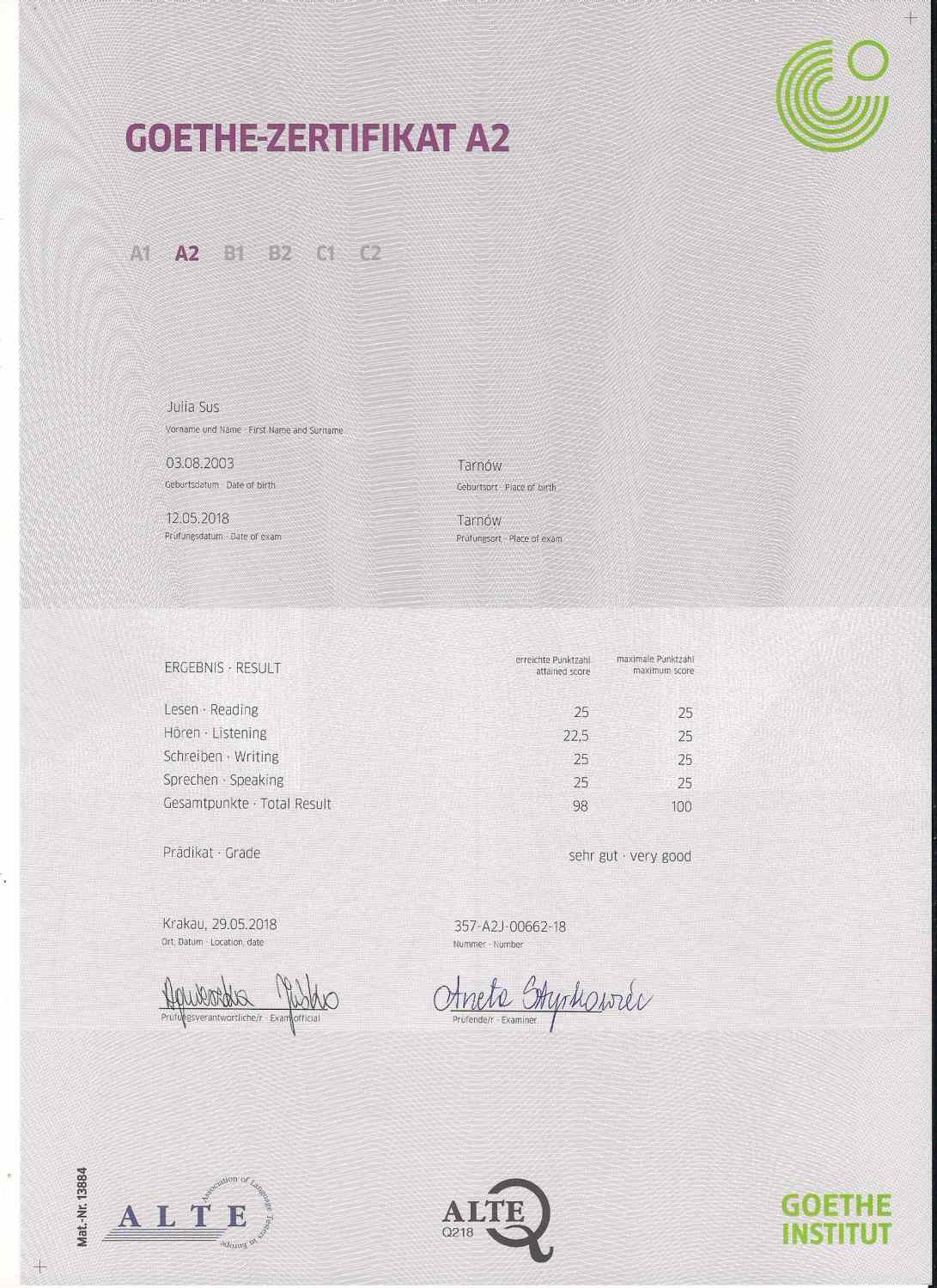 W ramach nagrody za tytuł laureata w konkursie „Fit in Deutsch” obie uczennice otrzymały stypendium Goethe-Institut, które umożliwiło im bezpłatne podejście do egzaminów i uzyskanie wspomnianych certyfikatów. Egzamin Goethe-Zertifikat składa się z czterech części i sprawdza następujące sprawności językowe: słuchanie ze zrozumieniem, mówienie, czytanie ze zrozumieniem i pisanie. Zosia i Julka otrzymały najwyższe oceny na danym poziomie językowym. Gratulujemy i życzymy dalszych sukcesów!