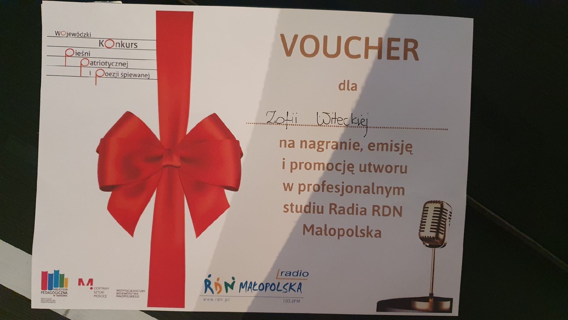 Laureatem został również Szymon Chatała - podopieczny pracowni wokalnej Pałacu Młodzieży. Otrzymał on nagrodę specjalną Jana Wojdaka - zaproszenie do udziału w koncercie Zespołu Wawele w Radiu Kraków w dniu 25 listopada o godz. 19. Serdecznie zapraszamy do słuchania.