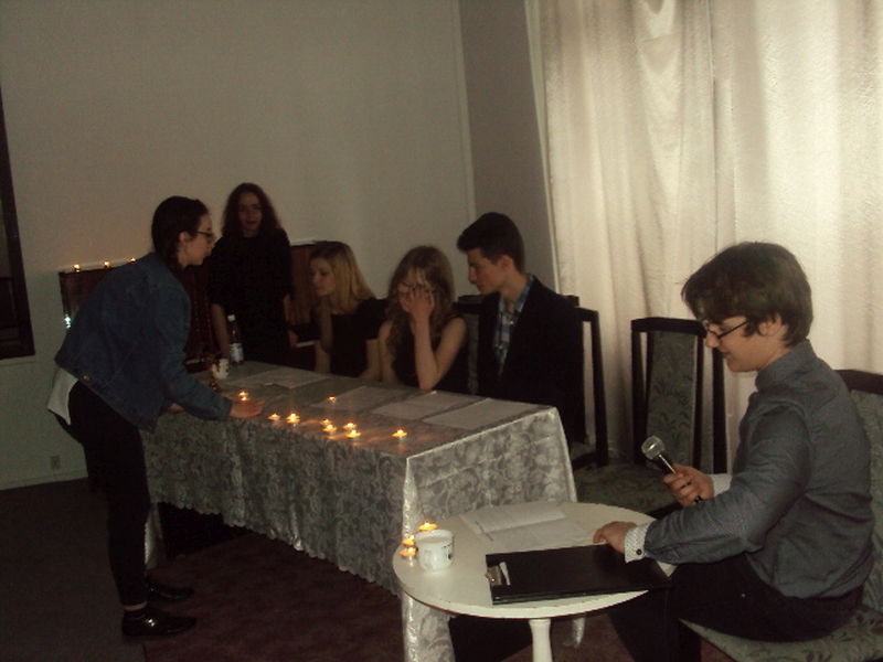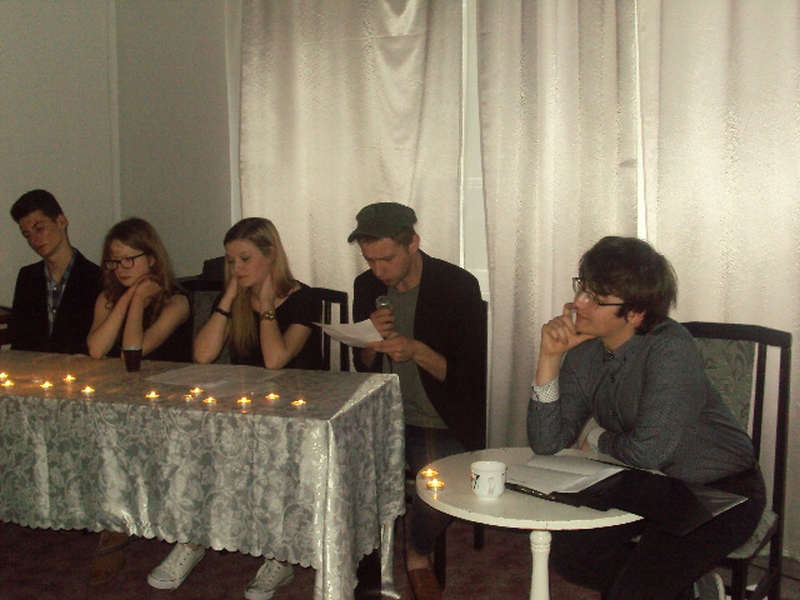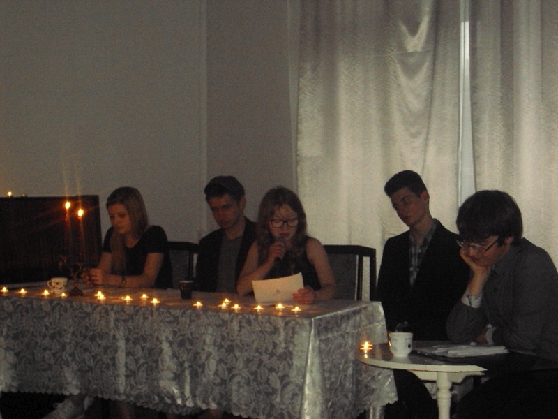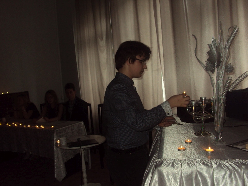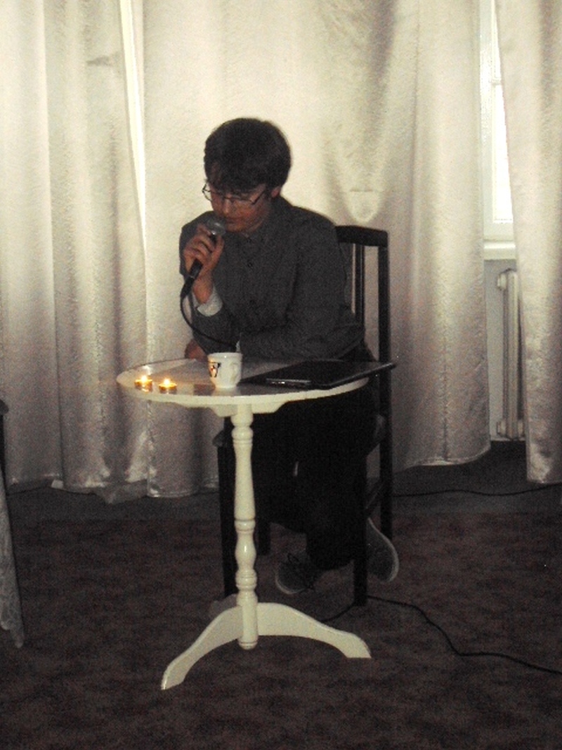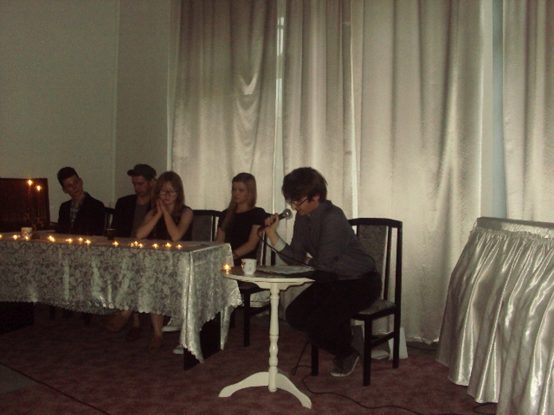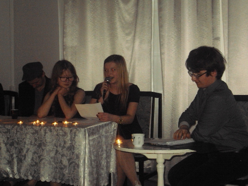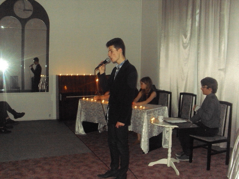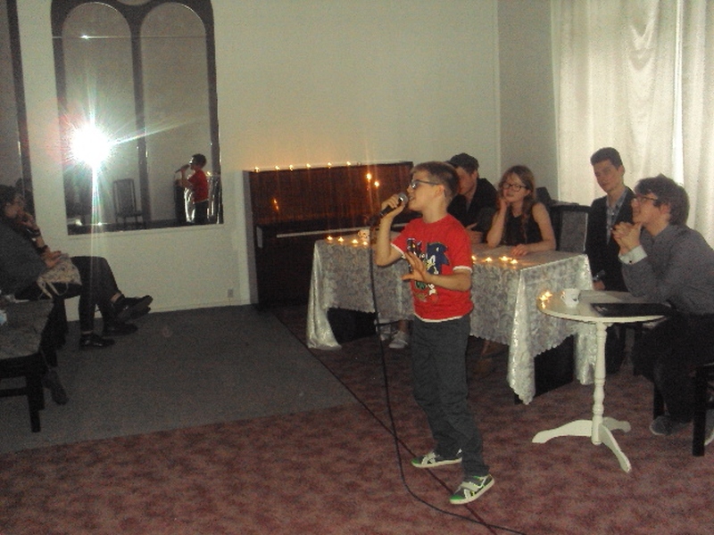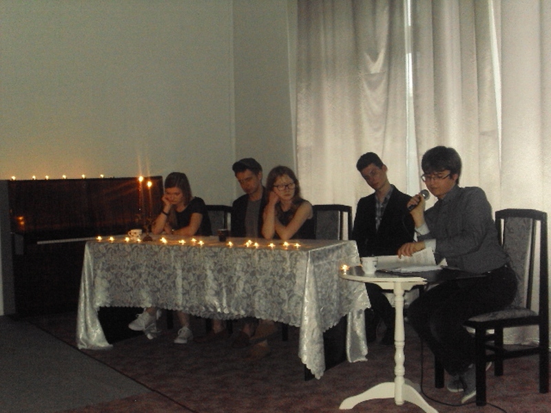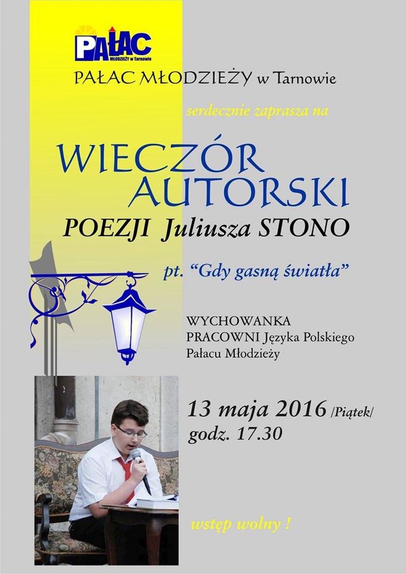 13 maja w piątek 2016 r. w Pałacu Młodzieży odbył się wieczór autorski poezji Juliusza Stono pt: ,,Gdy gasną światła”, wychowanka pracowni języka polskiego PM. Na początku Juliusz wyjaśnił genezę tytułu wieczorku, a następnie pięknie recytował swoje własne wiersze. Przed każdym tekstem, młody autor niezwykle ciekawie i barwnie opowiadał, co było inspiracją napisania danego tekstu. Wiersze Julka równie pięknie recytowali także jego przyjaciele- uczestnicy zajęć teatralnych PM z grupy starszej. Swoją obecnością zaszczycił nas Mateusz Żelazo- założyciel grupy teatralnej ,,Bez Wstydu”, który odczytał wiersz pt: ,,Syrena”. Przypomnijmy, że wiersz ten otworzył w tym roku Julkowi drogę do finału Wojewódzkiego Turnieju Jednego Wiersza o ,,Laur Jubilata” w Krakowie i ukazał się w Almanachu- zbiorze poezji młodych poetów. Autorem opiekuje się od strony językowej nauczycielka PM, Izabela Surdej. Julek posiada duży talent i ma ogromną chęć pisania, ale poezja nie jest jego jedyną pasją. Poza nią, jak mówił autor, jest jeszcze teatr, literatura, czy muzyka, które dają mu wiele radości. Imprezę uświetnili: Szymon Sworst i Adrian Foszcz- soliści z pracowni wokalnej Małgorzaty Boruch. Nagłośnienie przygotował Jerzy Mach. Wieczór poezji odbył się w nastrojowej, klimatycznej scenerii przy blasku świec, co było wspólnym pomysłem samego autora wierszy, jak i pozostałych uczestników zajęć teatralnych.