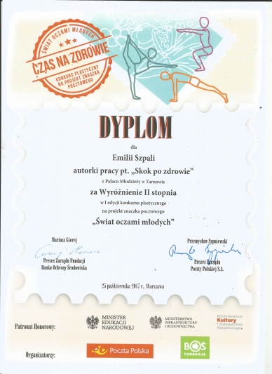 Koordynatorem Konkursu w pałacu Młodzieży był pan Grzegorz Mazur. Wybrane przez jury prace zostały wysłane do Siedziby Poczty Polskiej w Warszawie. Z nadesłanych z Pałacu prac wyróżnienie zdobyła Emilia Szpala i została zaproszona wraz z koordynatorem na wernisaż wygranych prac i rozdanie nagród. Uroczystość miała miejsce 26.10.2017 roku w Warszawie. Każdy nagrodzony uczestnik dostał dodatkowo swój rysunek wydrukowany na znaczkach pocztowych i pamiątkowy dyplom.