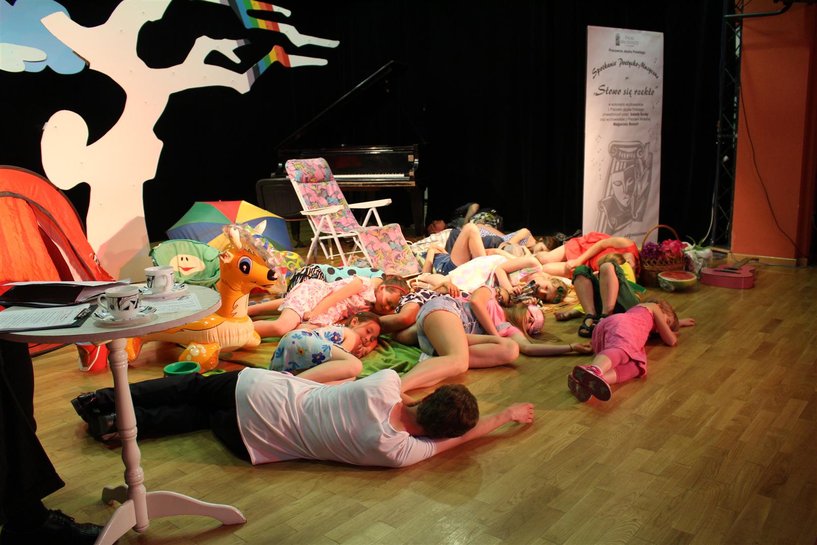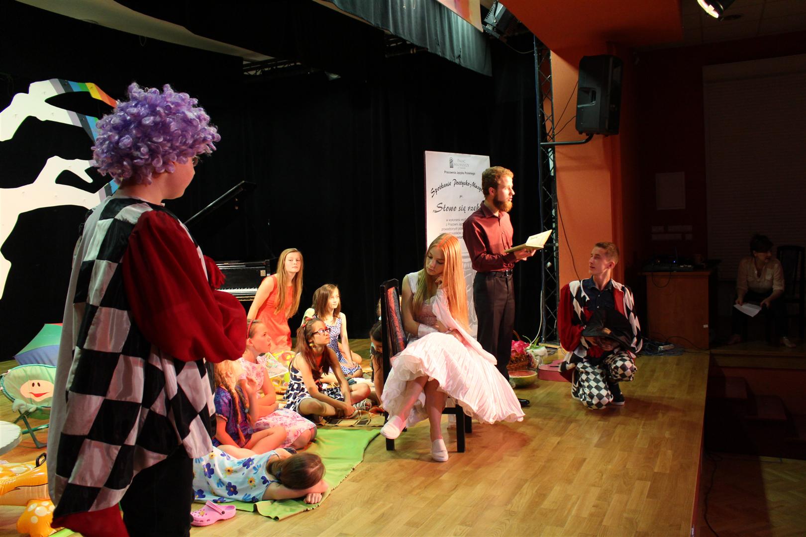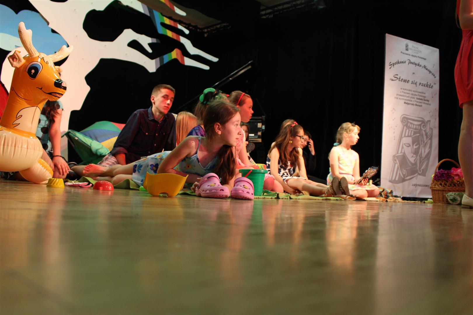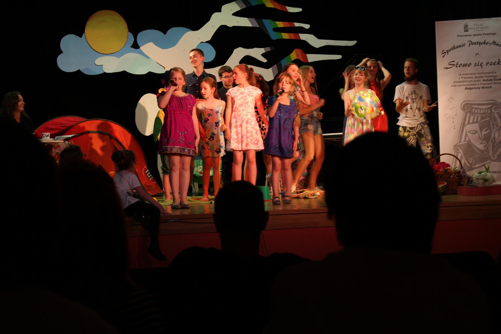 Spotkanie rozpoczęło się inscenizacją tekstu piosenki Jonasza Kofty ,,Radość o poranku”. Usłyszeliśmy nie tylko recytacje, ale można było również podziwiać inscenizacje rożnych tekstów literackich: komediowych, jak i filozoficznych. Wychowankowie z Pracowni Języka Polskiego zaprezentowali m.in. inscenizację wiersza: ,,Zakochane parasolki” H. Niewiadomskiej, ,,Zapach czekolady” D. Wawiłow, ,,Żabę” J. Brzechwy, czy ciekawą inscenizacją oryginalnego wiersza ortograficznego W. Gawdzika pt: ,,Smutna królewna”. Uczestnicy, zarówno z grupy młodszej, jak i starszej, przedstawili wiersze o różnej tematyce; od żartobliwej, komediowej, po filozoficzną, poważną różnych twórców, m.in. K.I. Gałczyńskiego, J. Brzechwy, D. Wawiłow, L.J. Kerna, A. Osieckiej, czy W. Szymborskiej, M. Konopnickiej, J. Brela , które uczyli sie na zajęciach, prezentowali na różnych konkursach recytatorskich. A wszystko to ,,przeplatane” z pięknymi, różnymi tematycznie wystąpieniami muzycznymi wychowanków z Pracowni Wokalnej. Scena teatralna PM ,,zamieniła się” w plażę, było dużo letnich akcentów, młodzi aktorzy zamiast za kurtyną, znajdowali się na leżakach, kocach, a na scenie ustawiono nawet namiot. Pojawiły się także kompozycje z owoców i kwiatów- wszystko to stanowiło elementy scenografii przygotowanej przez Izabelę Surdej z pomocą rodziców uczestników zajęć. Podczas imprezy panowała miła i sympatyczna atmosfera. Zaciekawiona i zachęcona tym , co dzieje się na scenie młoda widownia, zaczęła dołączać do będących na scenie wychowanków. Spotkanie zakończyło się inscenizacją wiersza L. J. Kerna : ,, Lato, lato…” znanego głownie jako tekst piosenki. Wychowankowie zakończyli występ słowami: ,,Lato, lato, lato czeka… a po lecie czeka na nas …. Pałac Młodzieży ! ”. Imprezę wspólnie poprowadzili: Izabela Surdej i Jerzy Świtek. Spotkanie poetycko-muzyczne trwało ok. 2 godziny i dostarczyło wiele miłych przeżyć oraz wrażeń.