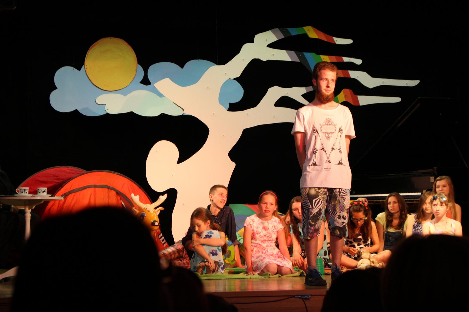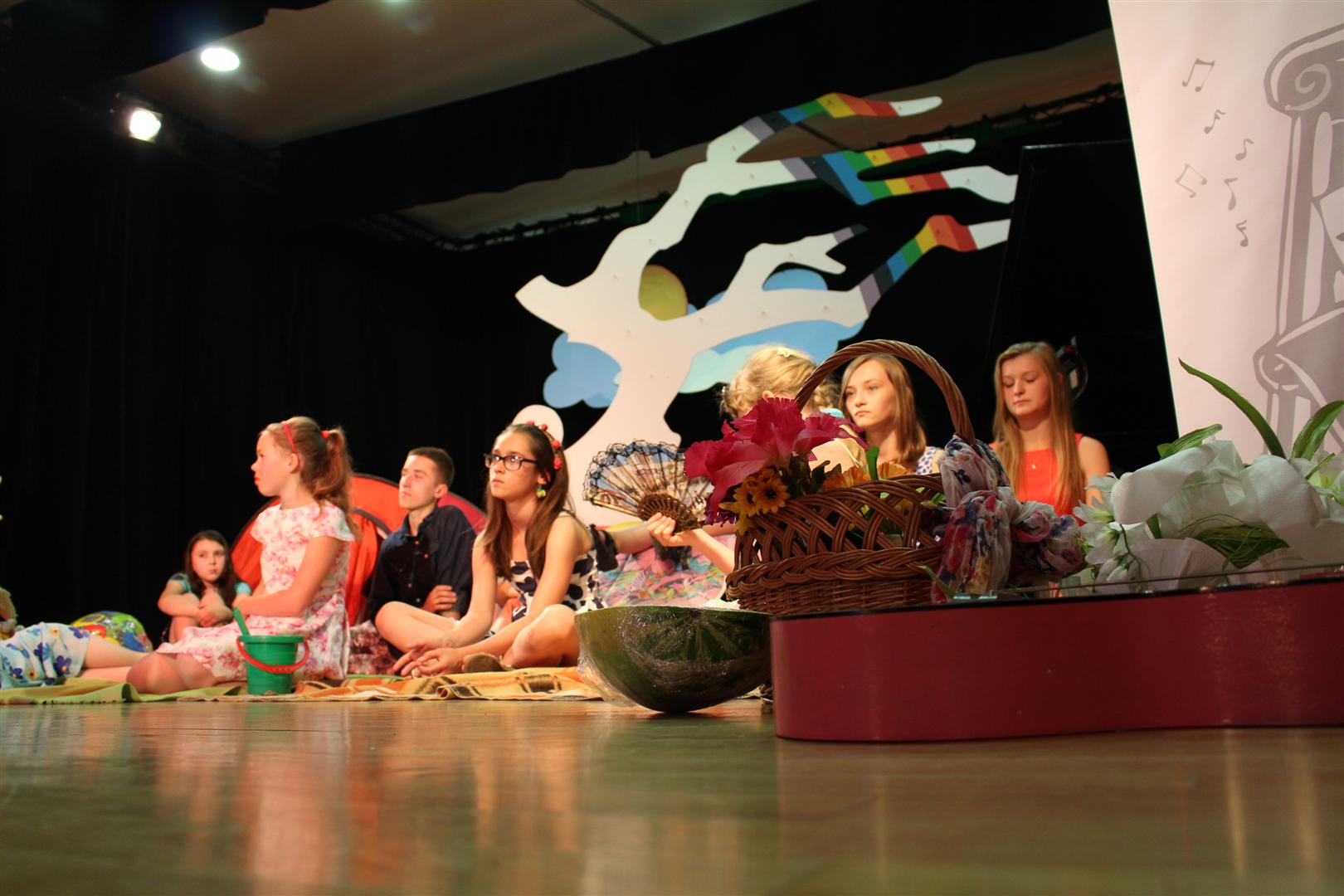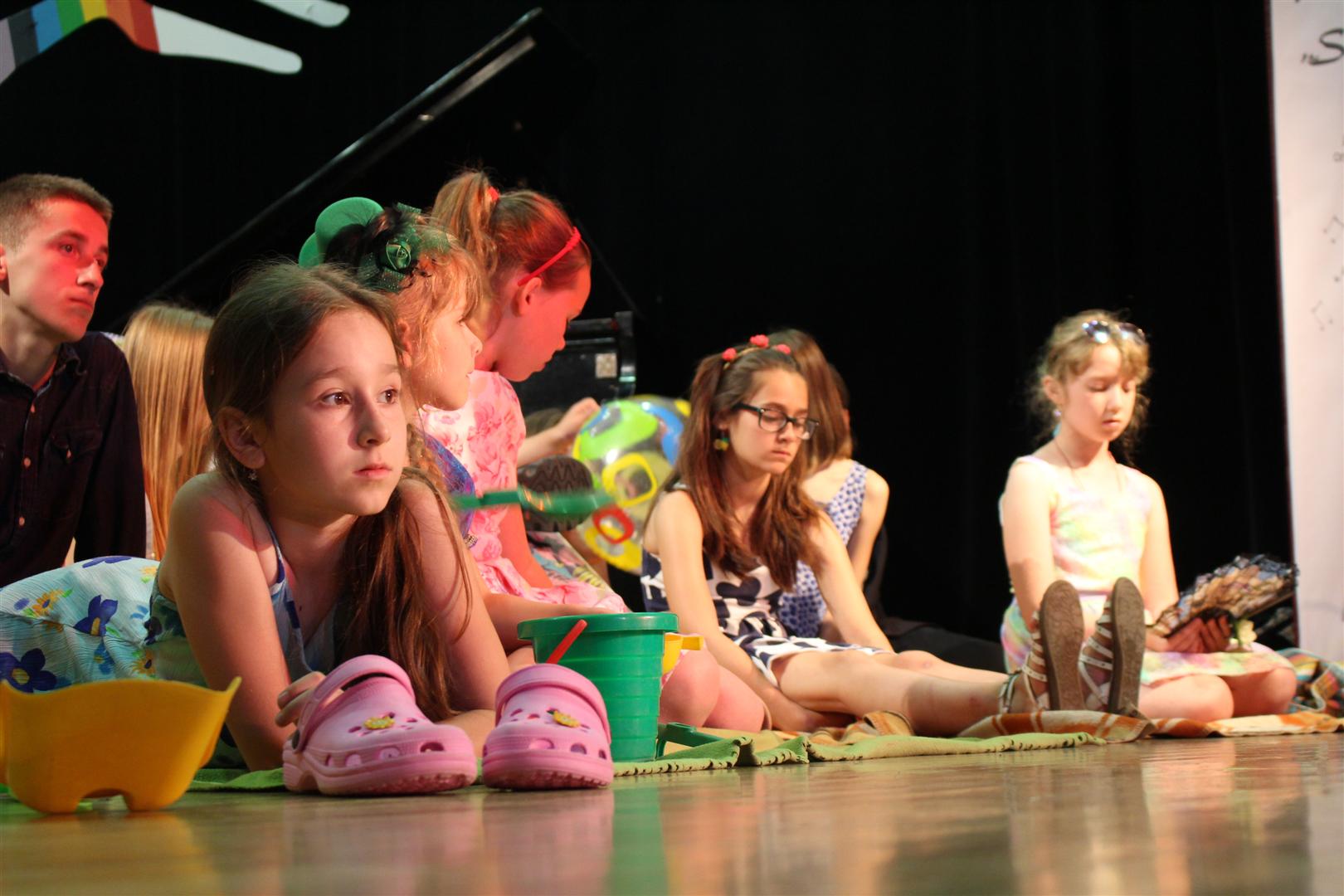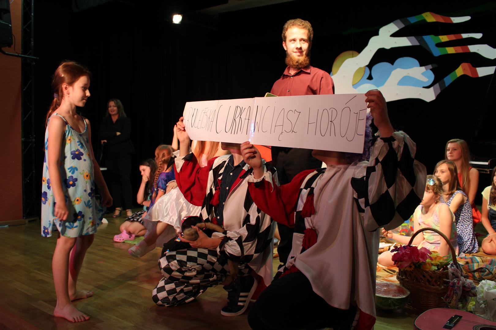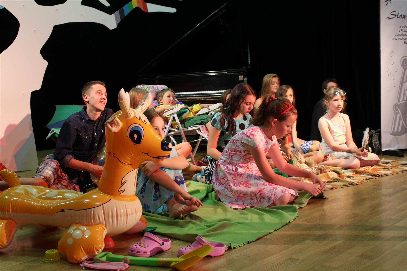 Spotkanie rozpoczęło się inscenizacją tekstu piosenki Jonasza Kofty ,,Radość o poranku”. Usłyszeliśmy nie tylko recytacje, ale można było również podziwiać inscenizacje rożnych tekstów literackich: komediowych, jak i filozoficznych. Wychowankowie z Pracowni Języka Polskiego zaprezentowali m.in. inscenizację wiersza: ,,Zakochane parasolki” H. Niewiadomskiej, ,,Zapach czekolady” D. Wawiłow, ,,Żabę” J. Brzechwy, czy ciekawą inscenizacją oryginalnego wiersza ortograficznego W. Gawdzika pt: ,,Smutna królewna”. Uczestnicy, zarówno z grupy młodszej, jak i starszej, przedstawili wiersze o różnej tematyce; od żartobliwej, komediowej, po filozoficzną, poważną różnych twórców, m.in. K.I. Gałczyńskiego, J. Brzechwy, D. Wawiłow, L.J. Kerna, A. Osieckiej, czy W. Szymborskiej, M. Konopnickiej, J. Brela , które uczyli sie na zajęciach, prezentowali na różnych konkursach recytatorskich. A wszystko to ,,przeplatane” z pięknymi, różnymi tematycznie wystąpieniami muzycznymi wychowanków z Pracowni Wokalnej. Scena teatralna PM ,,zamieniła się” w plażę, było dużo letnich akcentów, młodzi aktorzy zamiast za kurtyną, znajdowali się na leżakach, kocach, a na scenie ustawiono nawet namiot. Pojawiły się także kompozycje z owoców i kwiatów- wszystko to stanowiło elementy scenografii przygotowanej przez Izabelę Surdej z pomocą rodziców uczestników zajęć. Podczas imprezy panowała miła i sympatyczna atmosfera. Zaciekawiona i zachęcona tym , co dzieje się na scenie młoda widownia, zaczęła dołączać do będących na scenie wychowanków. Spotkanie zakończyło się inscenizacją wiersza L. J. Kerna : ,, Lato, lato…” znanego głownie jako tekst piosenki. Wychowankowie zakończyli występ słowami: ,,Lato, lato, lato czeka… a po lecie czeka na nas …. Pałac Młodzieży ! ”. Imprezę wspólnie poprowadzili: Izabela Surdej i Jerzy Świtek. Spotkanie poetycko-muzyczne trwało ok. 2 godziny i dostarczyło wiele miłych przeżyć oraz wrażeń.