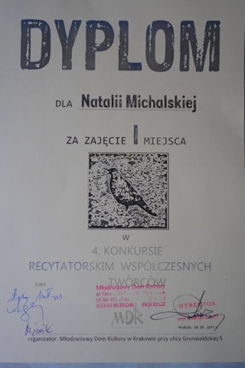 Rok szkolny zakończył się dużymi sukcesami dla wychowanków pracowni języka polskiego Pałacu Młodzieży w Tarnowie.  22.06.2017r. w MDK w Krakowie odbył się finał IV Wojewódzkiego Konkursu Recytatorskiego Współczesnych Twórców. Natalia Michalska (z grupy młodszej) zajęła I miejsce, a Aleksadra Łępa (z gr. gimnazjalno-licealnej) zajęła II miejsce. Warto dodać, że jest to pierwszy tak duży sukces Oli. Natalia i Aleksandra otrzymały pamiątkowe dyplomy, nagrody książkowe. Obie uczennice do konkursu zostały przygotowane przez nauczyciela Izabelę Surdej. Udział w eliminacjach wzięli udział także wytypowani wychowankowie zajęć teatralnych z grupy młodszej i starszej. Prezentacje konkursowe oceniało jury: Barbara Szałapak - aktorka Teatru Ludowego, Agata Rusin  - nauczyciel, instruktor teatralny, Beata Furgalska – animator kultury, Monika Ćwik – nauczyciel, kierownik Działu Artystycznego MDK