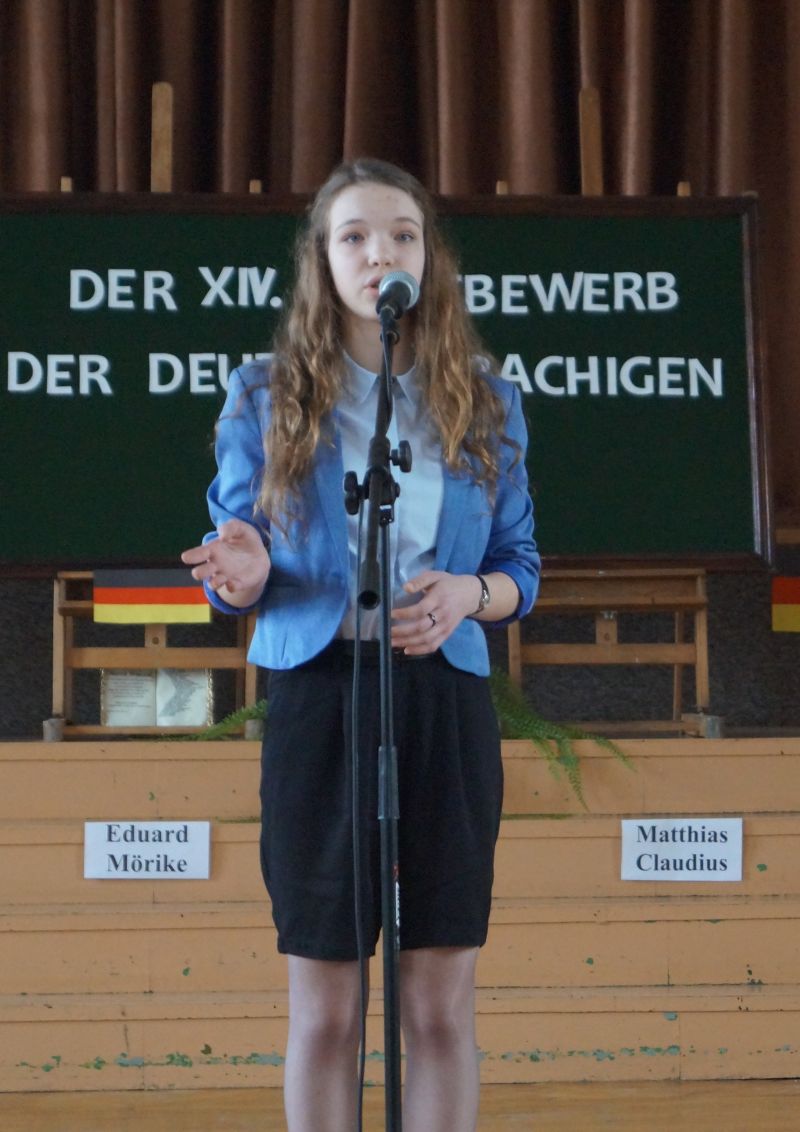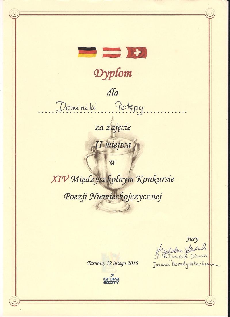 Uczestniczka zajęć pracowni języka niemieckiego Pałacu Młodzieży w Tarnowie, Dominika Potępa, zajęła II miejsce w kategorii szkół ponadgimnazjalnych w XIV Międzyszkolnym Konkursie Recytatorskim Poezji Niemieckojęzycznej organizowanym przez IV Liceum Ogólnokształcące w Tarnowie i skierowanym do młodzieży z powiatów tarnowskiego, brzeskiego i bocheńskiego. Tematem przewodnim tegorocznej edycji była przyroda i jej wpływ na stany emocjonalne człowieka. Jury złożone z pracowników Zakładu Filologii Germańskiej PWSZ w Tarnowie oceniało prezentację wierszy pod względem poprawności fonetycznej, interpretacji oraz ogólnego wyrazu artystycznego. Dominika została doceniona za recytację wiersza Ericha Kästnera „Die Wälder schweigen”. Naszą placówkę reprezentowały także Zuzanna Marszalik, Natasza Duch i Martyna Padło. Gratulujemy wszystkim uczestniczkom!